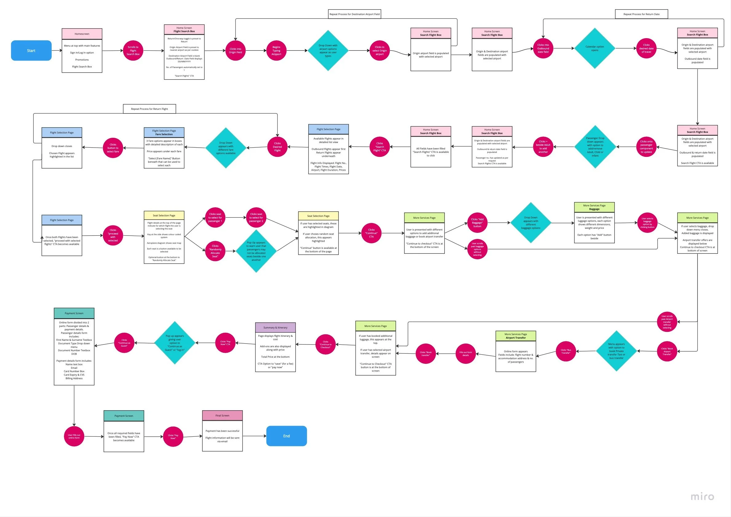 There were other areas in which I could optimise the user flow. Eliminating any unnecessary clicks/interactions would be key to streamlining the process and saving time for the user. The use of smart defaults (where possible) would also be beneficial. In order to do this, I created a flow diagram clearly showing each individual decision point and interaction made by the user. Mapping the ideal user journey at this stage would be crucial to ensuring an optimised and efficient user flow in the final designs.